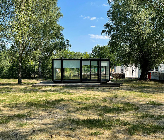 Seit Juni 2021 hat unser ROOMER-CUBE XL einen Platz im Birkenwäldchen auf dem Gelände des Goerzwerkes in Berlin gefunden. Auf einer punktuellen Gründung wurde zur Aufnahme des ROOMER-CUBE eine hölzerne Terrasse errichtet, die ihn stilsicher in Szene setzt.